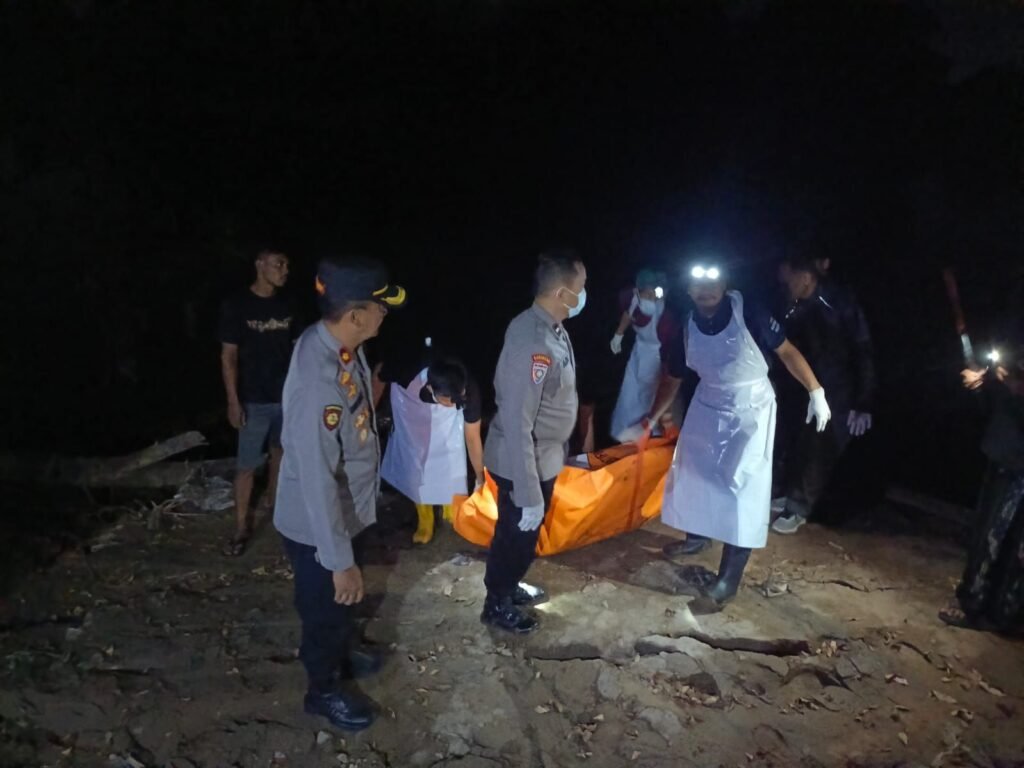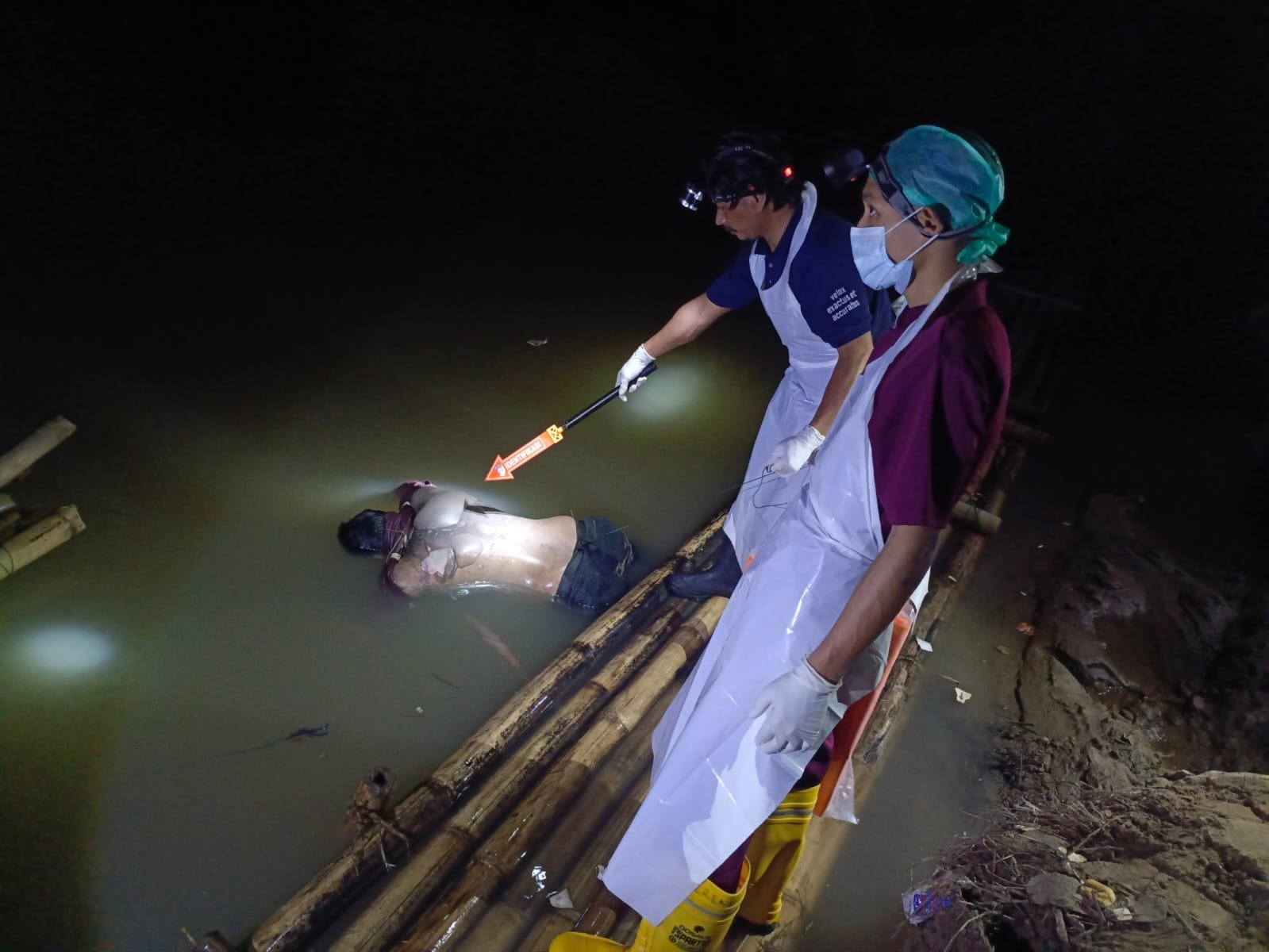 Informasi sementara , saat ditemukan posisi mayat tertelungkup/tengkurap, menggunakan kaos warna merah, celana pendek berbahan jeans, rambut potongan pendek dan kondisi tubuh sudah mengembang.
