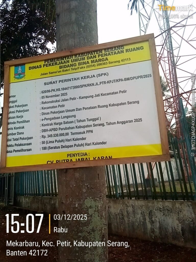 Pekerjaan infrastruktur yang dibiayai melalui Dana Bagi Hasil (DBH) APBD Kabupaten Serang Tahun Anggaran 2025 itu berada di bawah tanggung jawab Dinas Pekerjaan Umum dan Penataan Ruang (DPUPR) Kabupaten Serang, dengan nilai kontrak sebesar Rp349.530.000 dan dilaksanakan oleh CV Ditra Jarai Kadan.